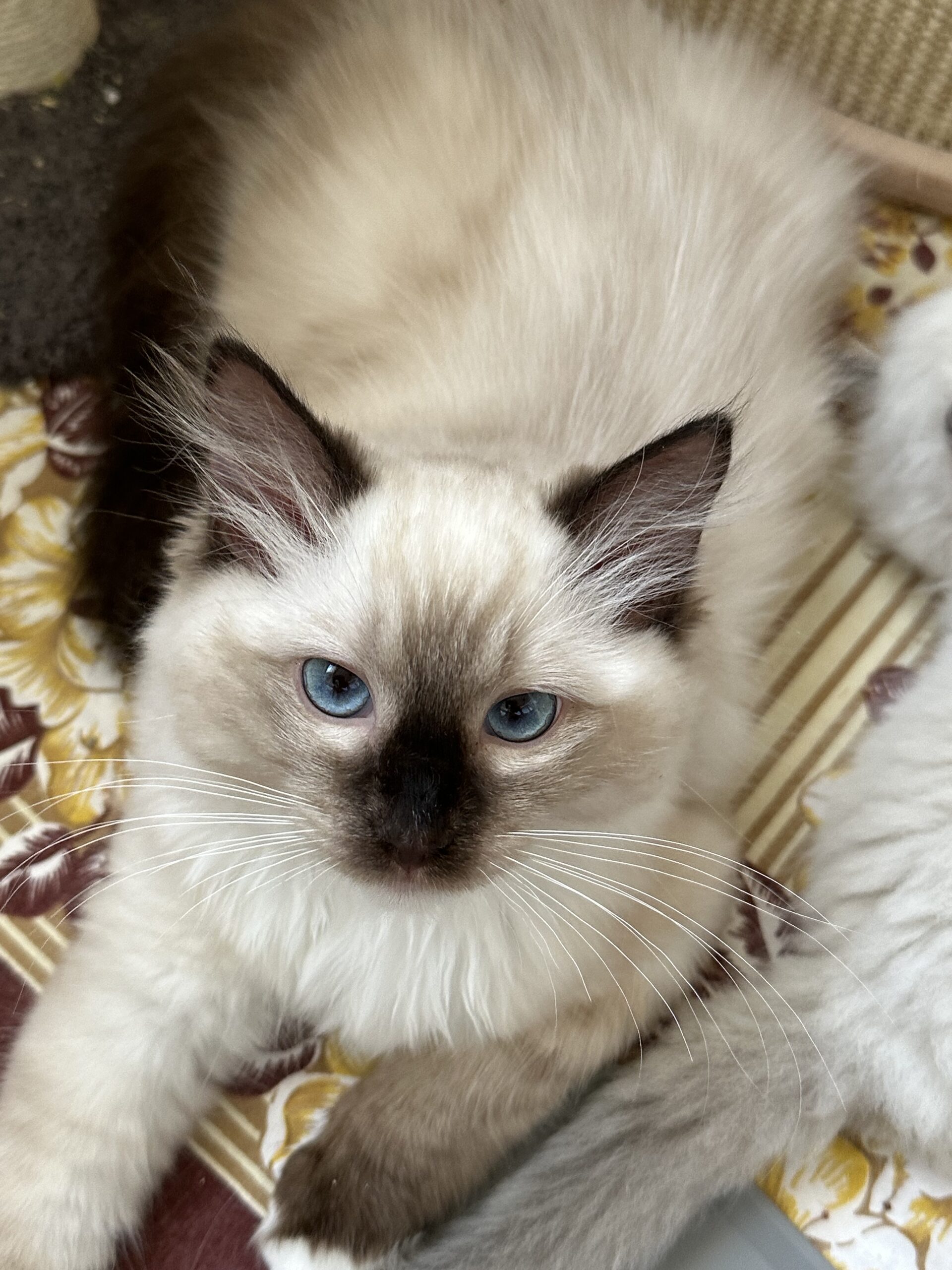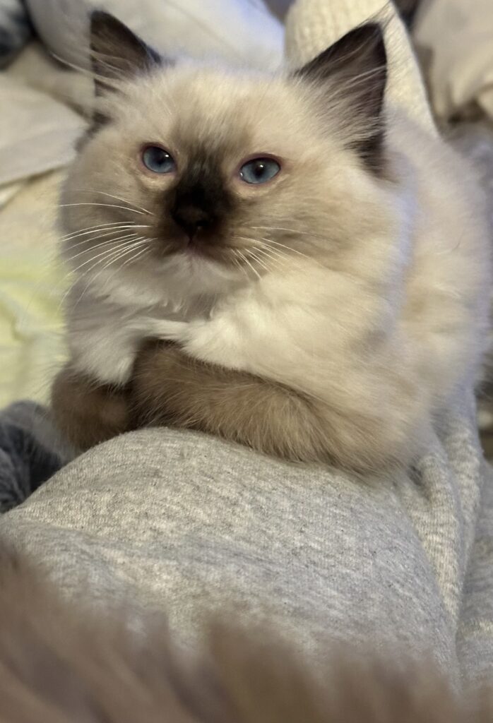 Dayo Puma Dino v. Traumauge, männlich, Seal Mitted. Er ist neugierig, sitzt, spielt oder schläft inzwischen gerne auch auf meinem Schoß. Nun futtert der kleine Sonnenschein selbstständig.